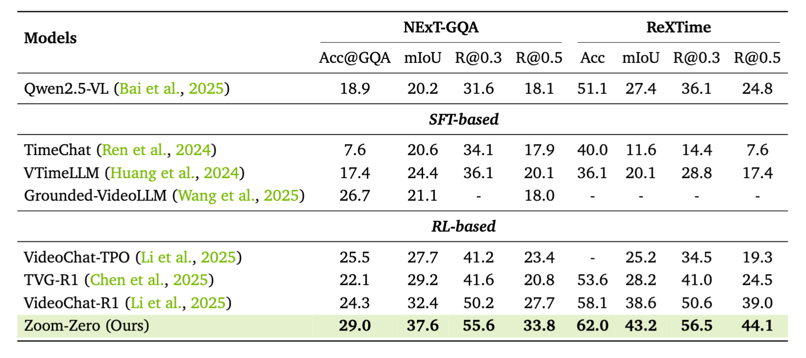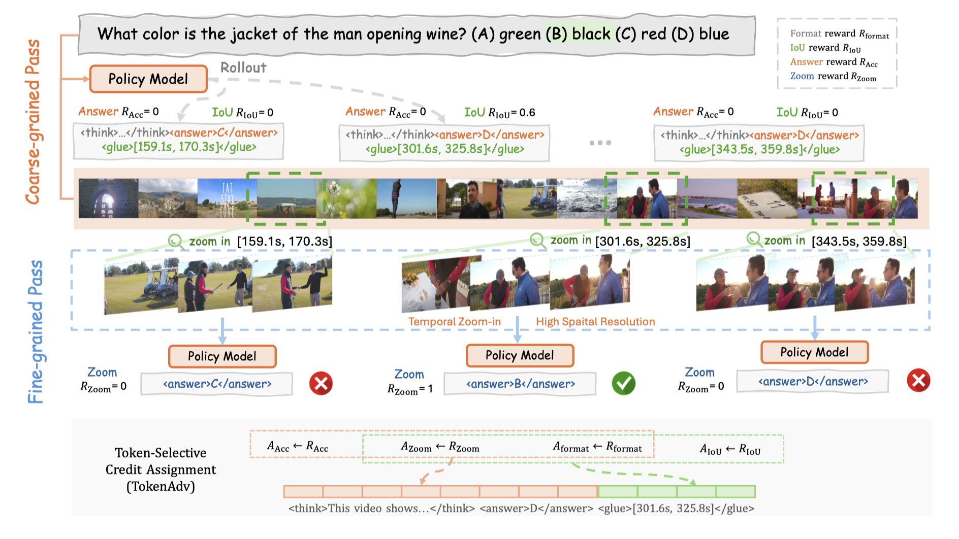 Grounded video question answering (GVQA) aims to localize relevant temporal segments in videos and generate accurate answers to a given question; however, large video-language models (LVLMs) exhibit limited temporal awareness. Although existing approaches based on Group Relative Policy Optimization (GRPO) attempt to improve temporal grounding, they still struggle to faithfully ground their answers in the relevant video evidence, leading to temporal mislocalization and hallucinations. In this work, we present Zoom-Zero, a coarse-to-fine framework that first localizes query-relevant segments and then temporally zooms into the most salient frames for finer-grained visual verification. Our method addresses the limits of GRPO for the GVQA task with two key innovations: (i) a zoom-in accuracy reward that validates the fidelity of temporal grounding prediction and facilitates fine-grained visual verification on grounded frames; (ii) token-selective credit assignment, which attributes rewards to the tokens responsible for temporal localization or answer generation, mitigating GRPO’s issue in handling multi-faceted reward signals. Our proposed method advances grounded video question answering, improving temporal grounding by 5.2% on NExT-GQA and 4.6% on ReXTime, while also enhancing average answer accuracy by 2.4%. Additionally, the coarse-to-fine zoom-in during inference further benefits long-form video understanding by preserving critical visual details without compromising global context, yielding an average improvement of 6.4% on long-video benchmarks.